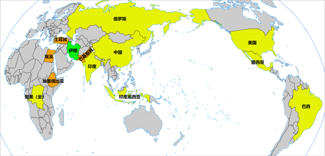 ① 规模大于伊朗的国家里,刚果(金)、巴西、印尼都是赤道穿过的国家,主体在南半球,与其它大国之间保持“距离”。美国、墨西哥接壤,而俄罗斯、中国、印度直接接壤,事实上印尼与中国也是海上近邻。