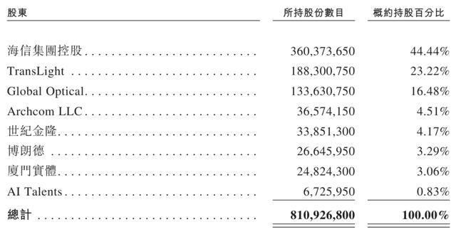 IPO前,海信集团控股持股为44.44%,TransLight持股为23.22%;