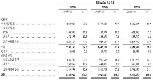 纳真科技2025年来自数通光模块收入为54.69亿元,占比为65.5%,来自光网络终端盒子收入为12.32亿元,占比为14.7%。